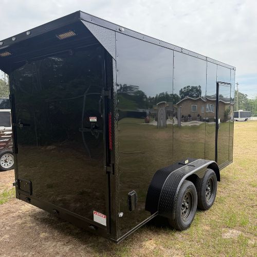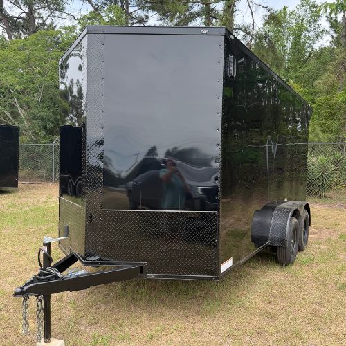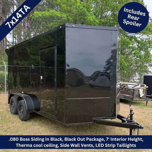 This 7×14 Tandem Axle Black Blackout Enclosed Trailer comes with a Rear Spoiler! Top-quality construction by South River Cargo Trailers.