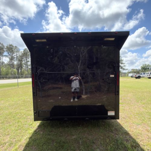 This 8.5×16 Tandem Axle Black Enclosed Trailer with Blackout Package has a Rear Spoiler with LEDs!