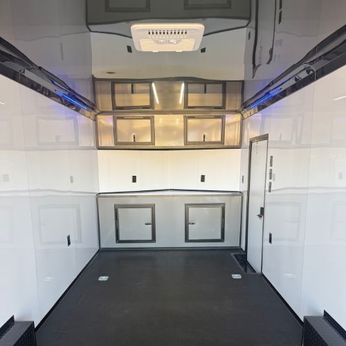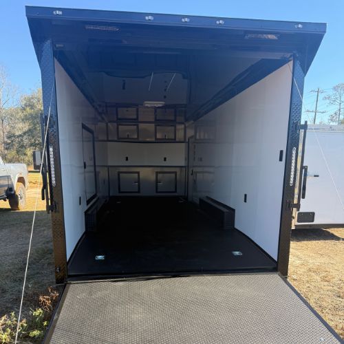 This 8.5×24 Tandem Axle Black Enclosed Race Trailer comes with a rear spoiler and fully finished interior!