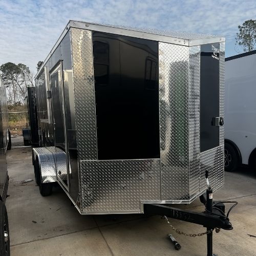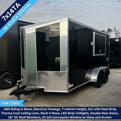 This Titanium Cargo 7×14 Tandem Axle Concession Trailer with two concession windows is in stock and on SALE today! VIN 13852 is ready to go today for only $9750.00! Get it today before it’s gone!