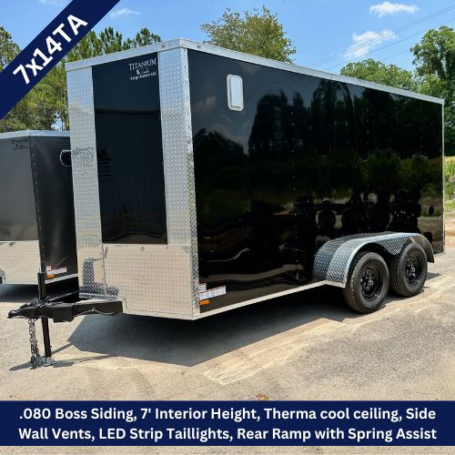 This 7X14 Tandem Axle is the perfect size for many uses. Black .080 Boss Siding gives this unit a super clean look.  Top-quality construction by Titanium Cargo Trailers.