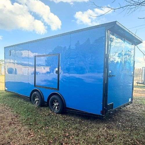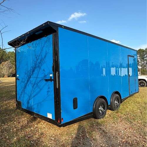 This 8.5×20 Tandem Axle Electric Blue Enclosed Trailer with Blackout Package comes with an escape door and rear spoiler! Top quality construction by Titanium Cargo!