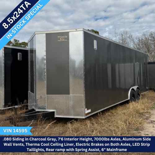 Titanium Cargo 8.5×24 Tandem Axle Charcoal Enclosed Trailer – $9150 on sale for $8150  VIN 14595 is on SALE now under manufacturer cost! Get it before it’s gone!! Top-quality construction by Titanium Cargo Trailers.