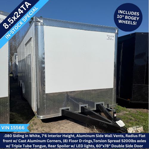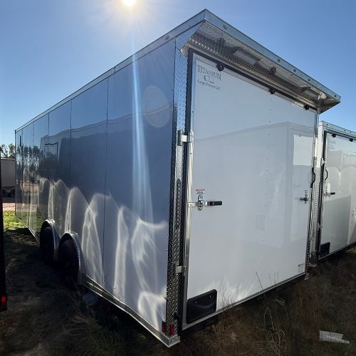 Titanium Cargo 8.5×24 Tandem Axle White Enclosed Trailer with Spread Axles – $9,995.00 on sale for $9,500.00.  VIN 15566 is on SALE now under manufacturer cost! Get it before it’s gone!!   Top-quality construction by Titanium Cargo Trailers.