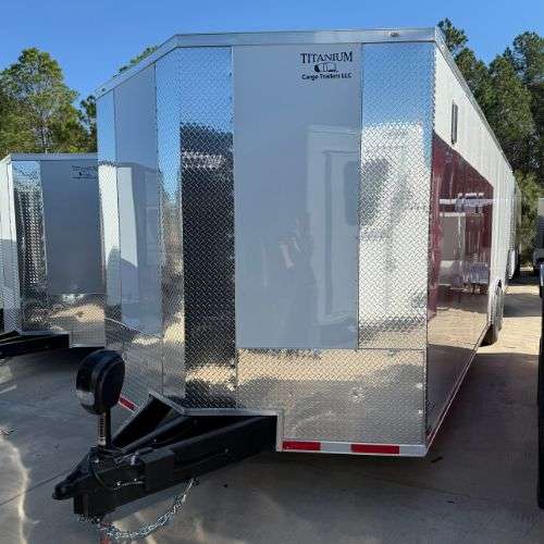 This Titanium Cargo 8.5×28 Tandem Axle White Enclosed Trailer with Electric Jack is in stock! Top-quality construction by Titanium Cargo Trailers.