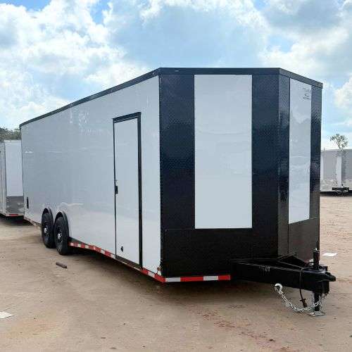 This Titanium Cargo 8.5x28TA White Spread Axle with Black Out is large and in charge! Escape Door makes this the perfect car hauler. Wide width for more payload complete with spread axles.    Top-quality construction by Titanium Cargo Trailers.