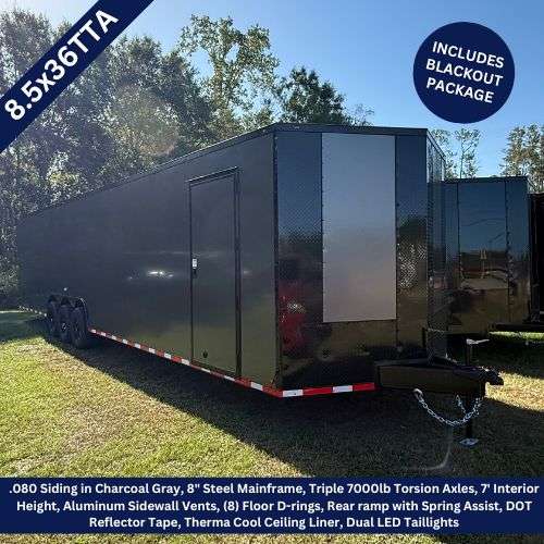 This Titanium Cargo is large and in charge! It’s ready to go today. 8.5×36 Triple Axle Charcoal Gray Enclosed Cargo Trailer made with Top-quality construction by Titanium Cargo Trailers.